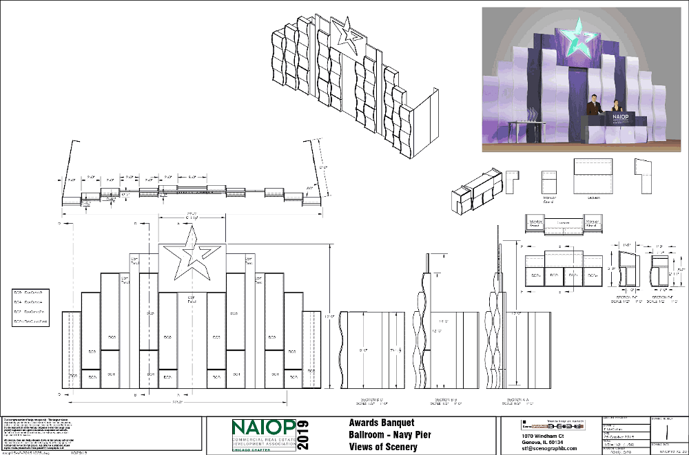 NAIOP Chicago Chapter annual awards show at Navy Pier. NAIOP Chicago Chapter annual awards show at Navy Pier. NAIOP Chicago Chapter annual awards show at Navy Pier. National Association of Industrial Properties (NAIOP) Chicago Chapter annual awards show at Navy Pier. Preliminary sketch of the scenery. Rendering of the Stage from Back of house. Rendering of the Scenery from house left. Rendering of the Scenery from the middle of the house. Elevation of the overhead star. dwg1Views of the Set. dwg1nGround Plan of the Ballroom in Navy Pier. MDRT Global Conference - Sydney 2019NCTA Broadband Nation