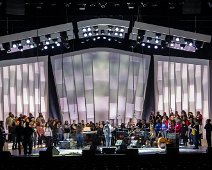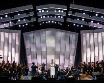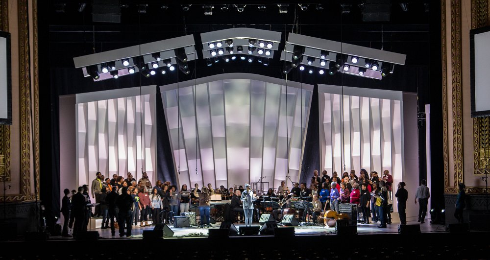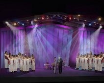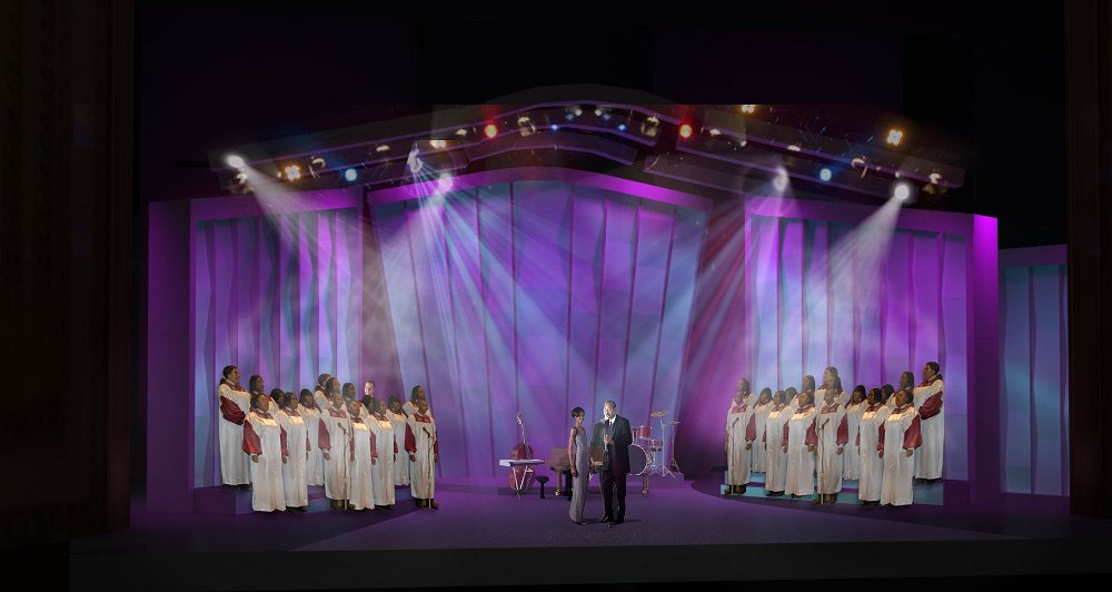 Rendering of the design for the set with a choir on stage.