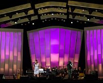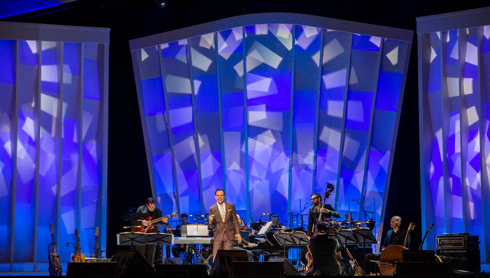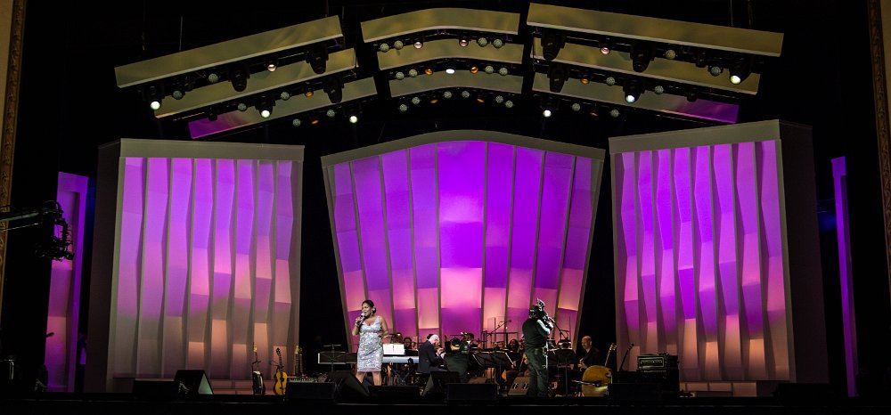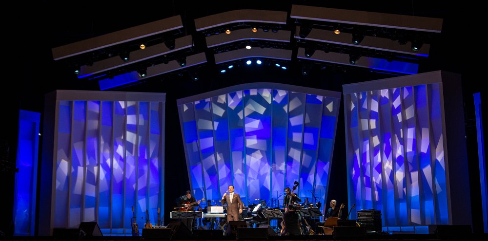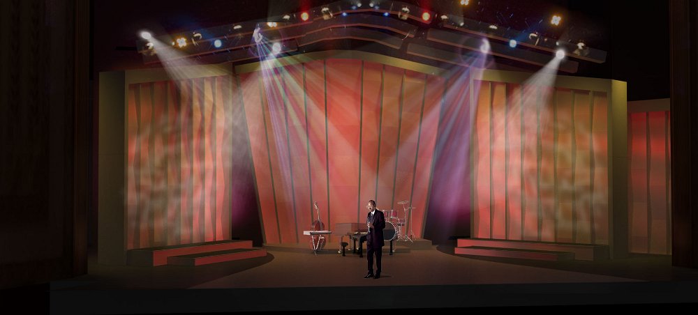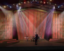 Rendering of the design for the set showing performers center stage.